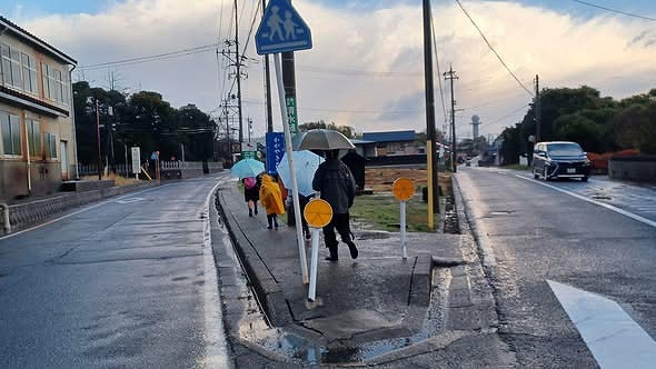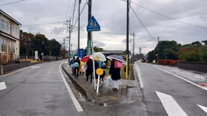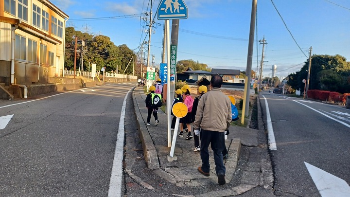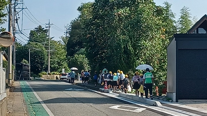 熊出没を受け、保護者に混じり先生も見守っておられるなか、